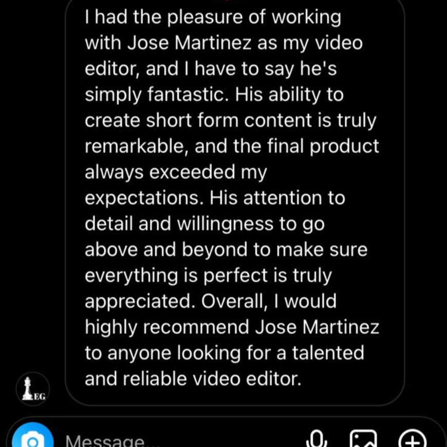 Hello, I am Jose, I like self-improvement stuff (the gym, eating clean, learning, etc.) If you make motivating and informative reels for your audience, I'll help you spread that cause whilst you continue further in your journey. 💪